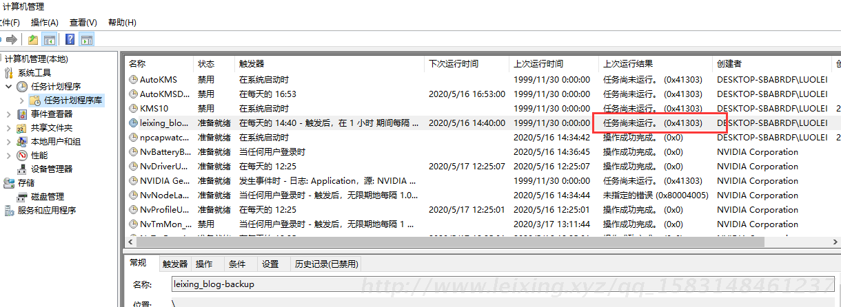 我这里使用的win10系统,到了计划时间发现任务并没有执行,上次运行结果:任务尚未运行(0x41303)
